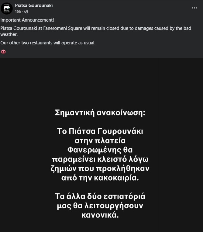 Εστιατόριο με ανακοίνωσή του στα social media ανακοίνωσε χθες Κυριακή πως μία από τις τοποθεσίες του θα παραμείνει κλειστή λόγω ζημιών από την κακοκαιρία.