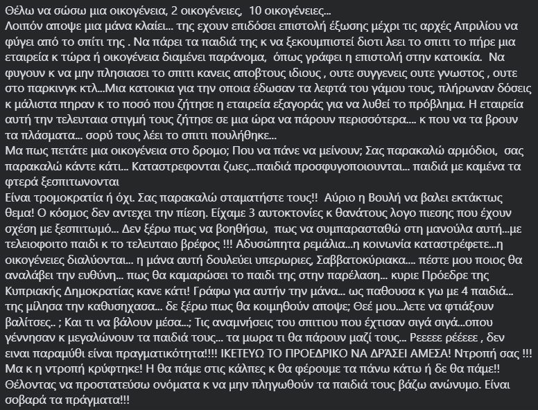 Η οικογένεια, στην οποία περιλαμβάνονται ανήλικα παιδιά, μεταξύ αυτών τελειόφοιτος μαθητής και βρέφος, βρίσκεται πλέον σε εξαιρετικά δύσκολη θέση, χωρίς σαφή εναλλακτική στέγασης.