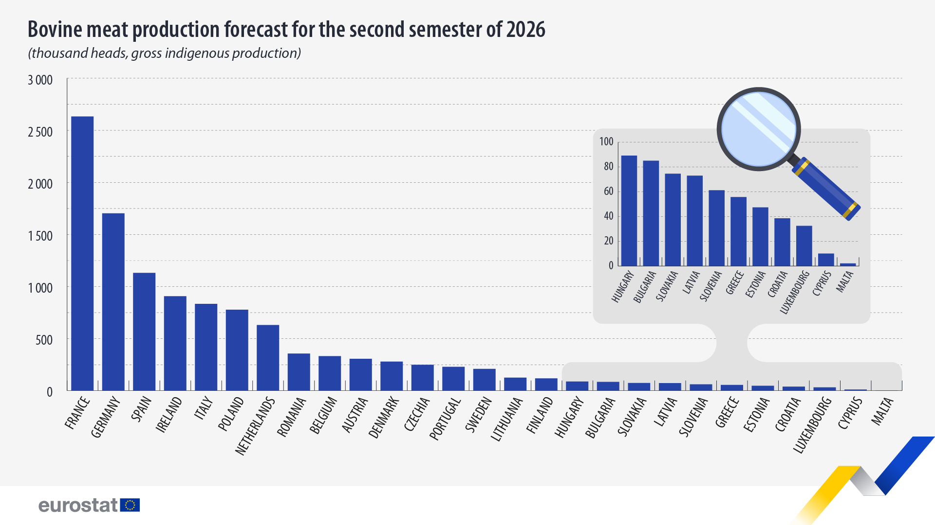 Σύμφωνα με τα επίσημα στοιχεία, το δεύτερο εξάμηνο του 2026 η ακαθάριστη εγχώρια παραγωγή βοοειδών στην ΕΕ αναμένεται να διολισθήσει στα 11,4 εκατομμύρια κεφάλια, καταγράφοντας πτώση 4,2% σε σχέση με το προηγούμενο έτος. Η Γαλλία, παρά τη μικρή κάμψη, διατηρεί τα ηνία της παραγωγής, ενώ η Ιρλανδία βλέπει τους αριθμούς της να υποχωρούν δραματικά κατά 5,2%.