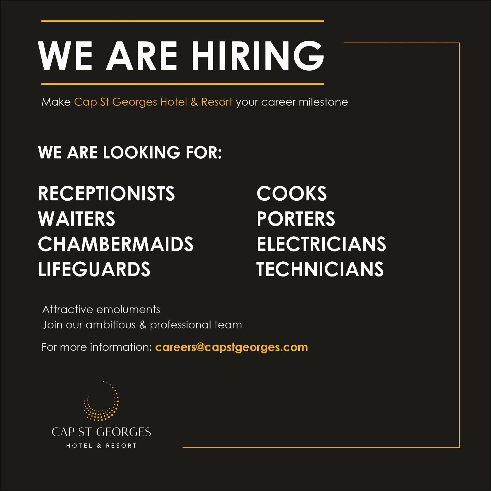 WE ARE HIRING: Make Cap St Georges Hotel & Resort your career milestone