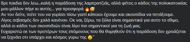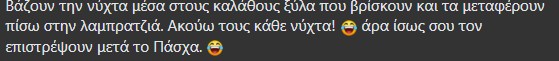 Δεν θα το βρει τον κάδο λένε άλλοι χρήστες στα σχόλια αφού μετά τη λαμπρατζιά συνήθως του καίνε ενώ αυτόπτης μάρτυρες είδαν νεαρούς να μεταφέρουν ξύλα από οικοδομή με κάδους απορριμμάτων.