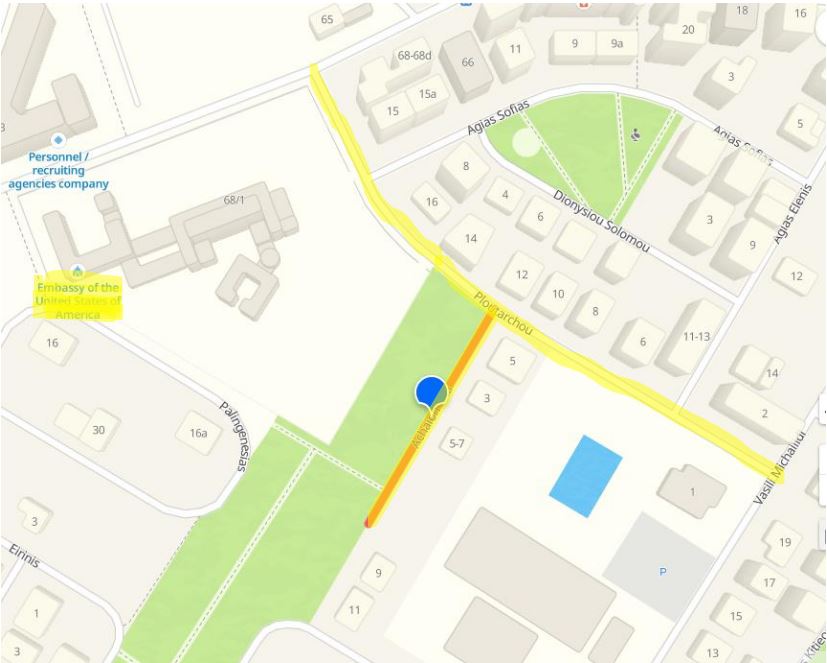 Χωροθέτηση παρόδιων χώρων στάθμευσης με οριζόντια σήμανση επί της (αδιεξόδου) οδού Αχαιών Ακτής, καθώς και σήμανση προτεραιότητας κατεύθυνσης κυκλοφορίας λόγω στένωσης της λωρίδας εξόδου προς την οδό Πλουτάρχου.