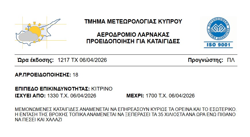 Κίτρινη προειδοποίηση εξέδωσε το Τμήμα Μετεωρολογικής Υπηρεσίας Κύπρου.