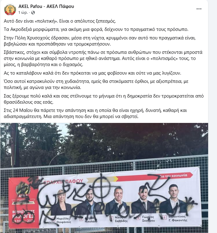 Έντονες αντιδράσεις προκαλεί περιστατικό βανδαλισμού προεκλογικού υλικού στην Πόλη Χρυσοχούς, με το ΑΚΕΛ Πάφου να καταγγέλλει δημόσια την ενέργεια μέσω ανάρτησης.