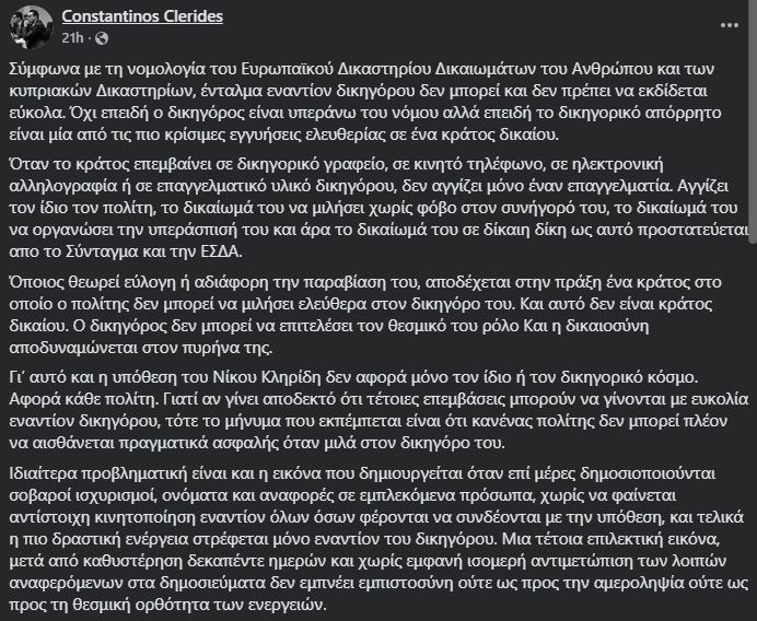 Ο ίδιος τονίζει ότι η υπόθεση δεν αφορά μόνο τον συγκεκριμένο δικηγόρο, αλλά αγγίζει συνολικά την εμπιστοσύνη των πολιτών προς το κράτος δικαίου, προειδοποιώντας πως η αποδοχή τέτοιων πρακτικών ενδέχεται να δημιουργήσει συνθήκες όπου οι πολίτες δεν θα αισθάνονται ασφαλείς να μιλήσουν ανοιχτά με τον δικηγόρο τους.