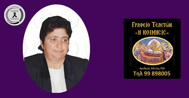 Η Εξόδιος Ακολουθία της, θα τελεστεί από τον Ιερό Ναό Αποστόλου Ανδρέα στο Πλατύ Αγλαντζιάς, την Παρασκευή 17 Απριλίου 2026, ώρα 16:00.