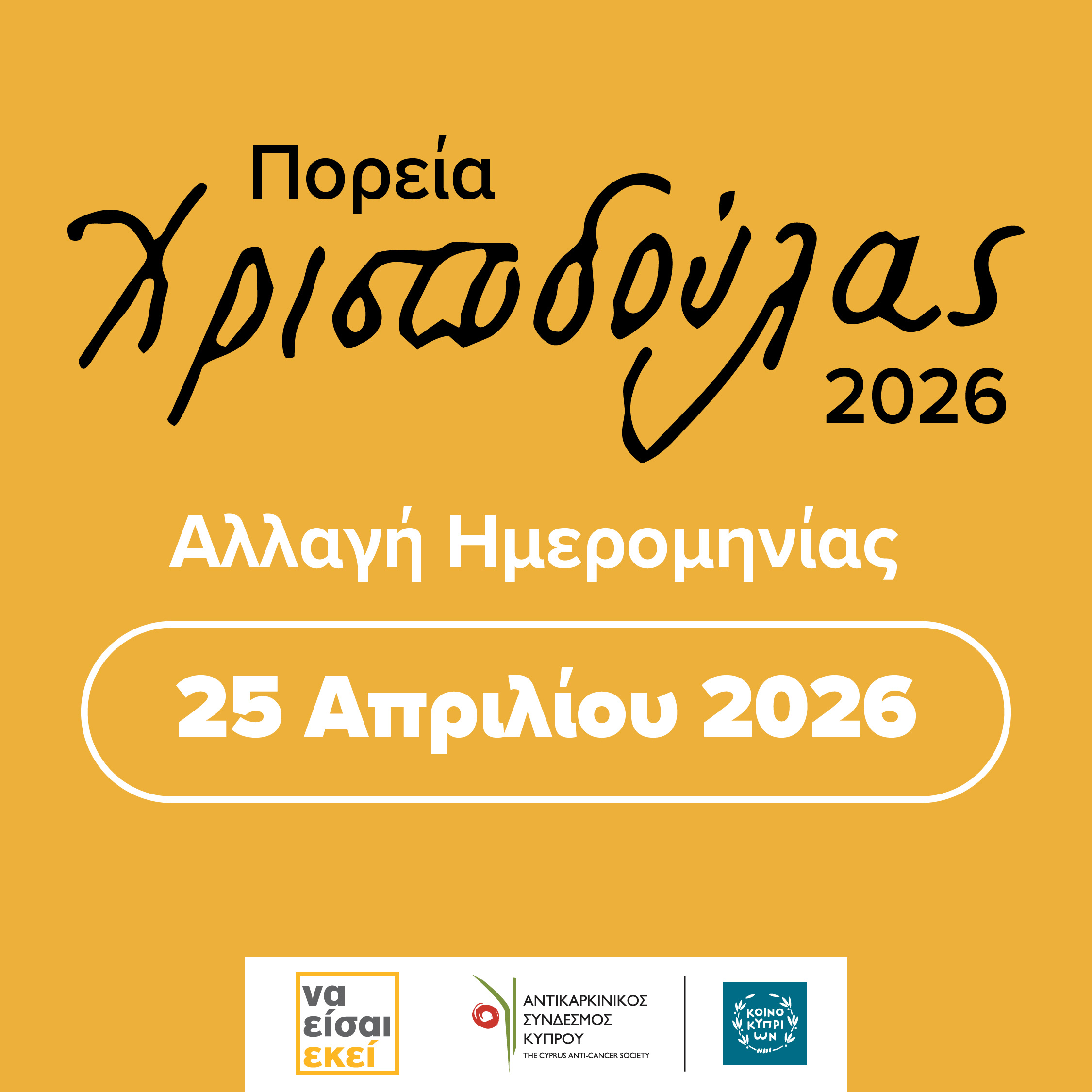 Ο Αντικαρκινικός Σύνδεσμος Κύπρου και η Τράπεζα Κύπρου ενημερώνουν ότι η Πορεία Χριστοδούλας 2026, που ήταν προγραμματισμένη για το Σάββατο 18 Απριλίου, αναβάλλεται λόγω των έντονων καιρικών φαινομένων που προβλέπονται από τη Μετεωρολογική Υπηρεσία.