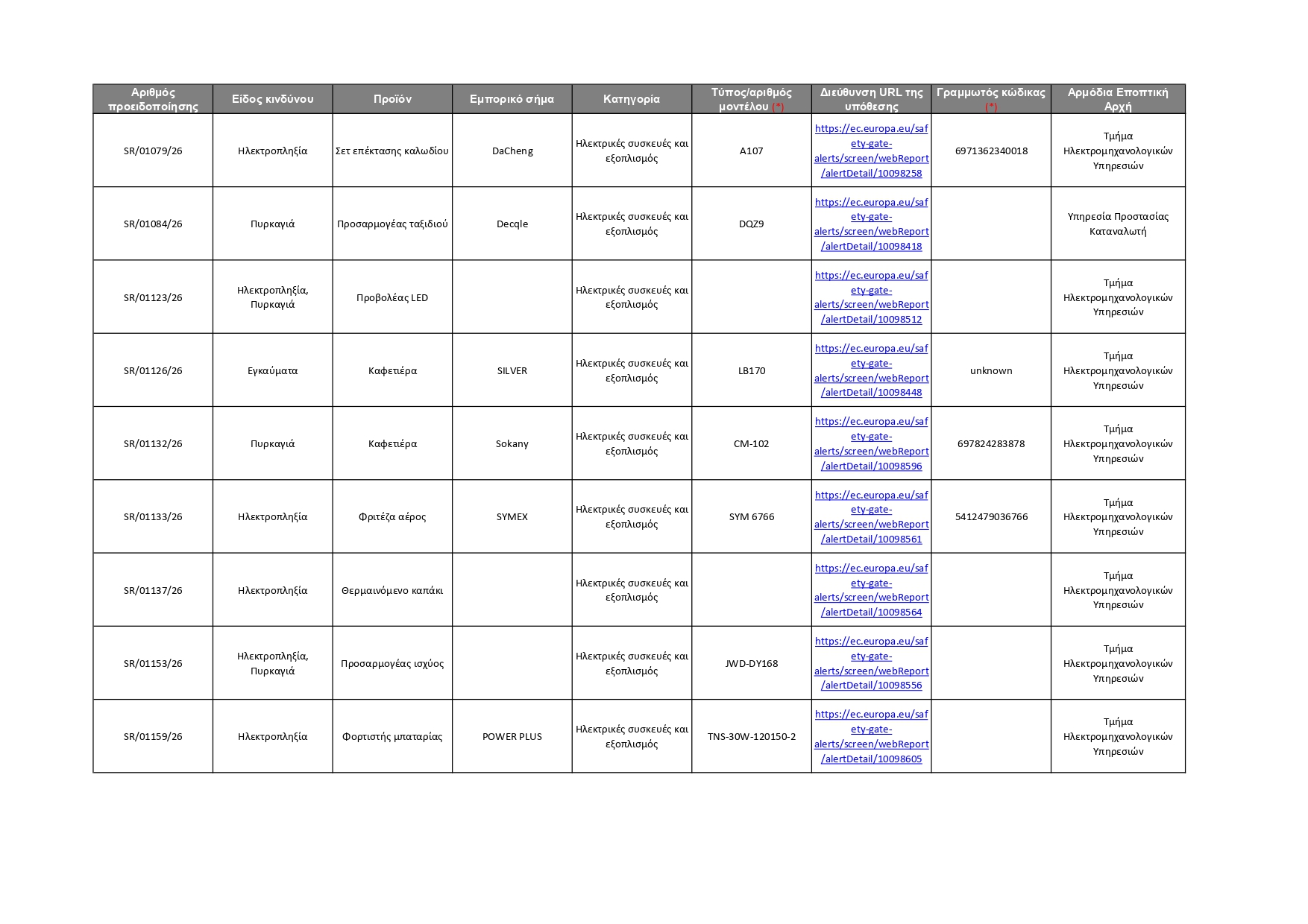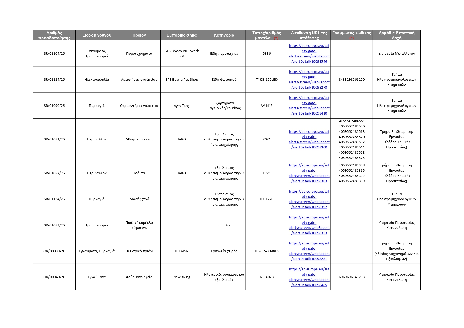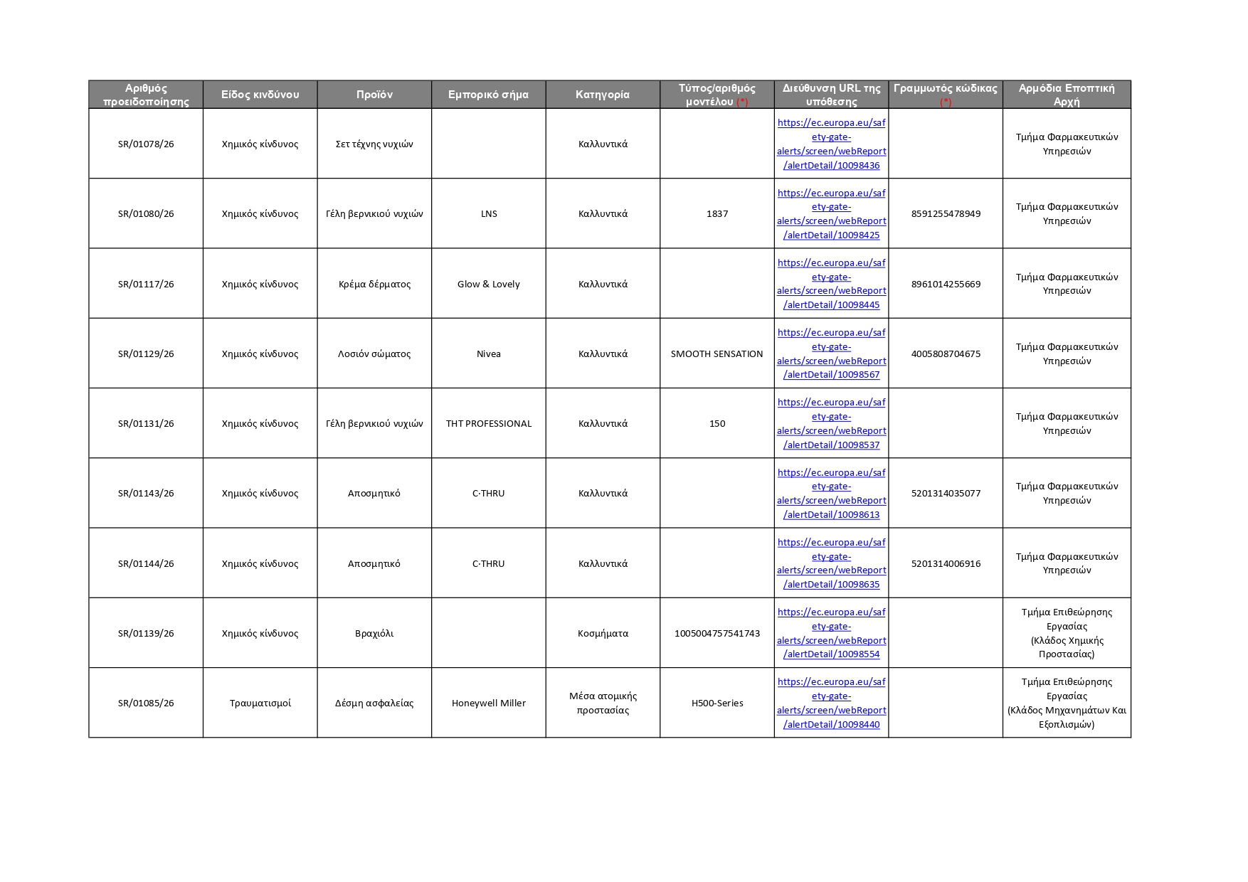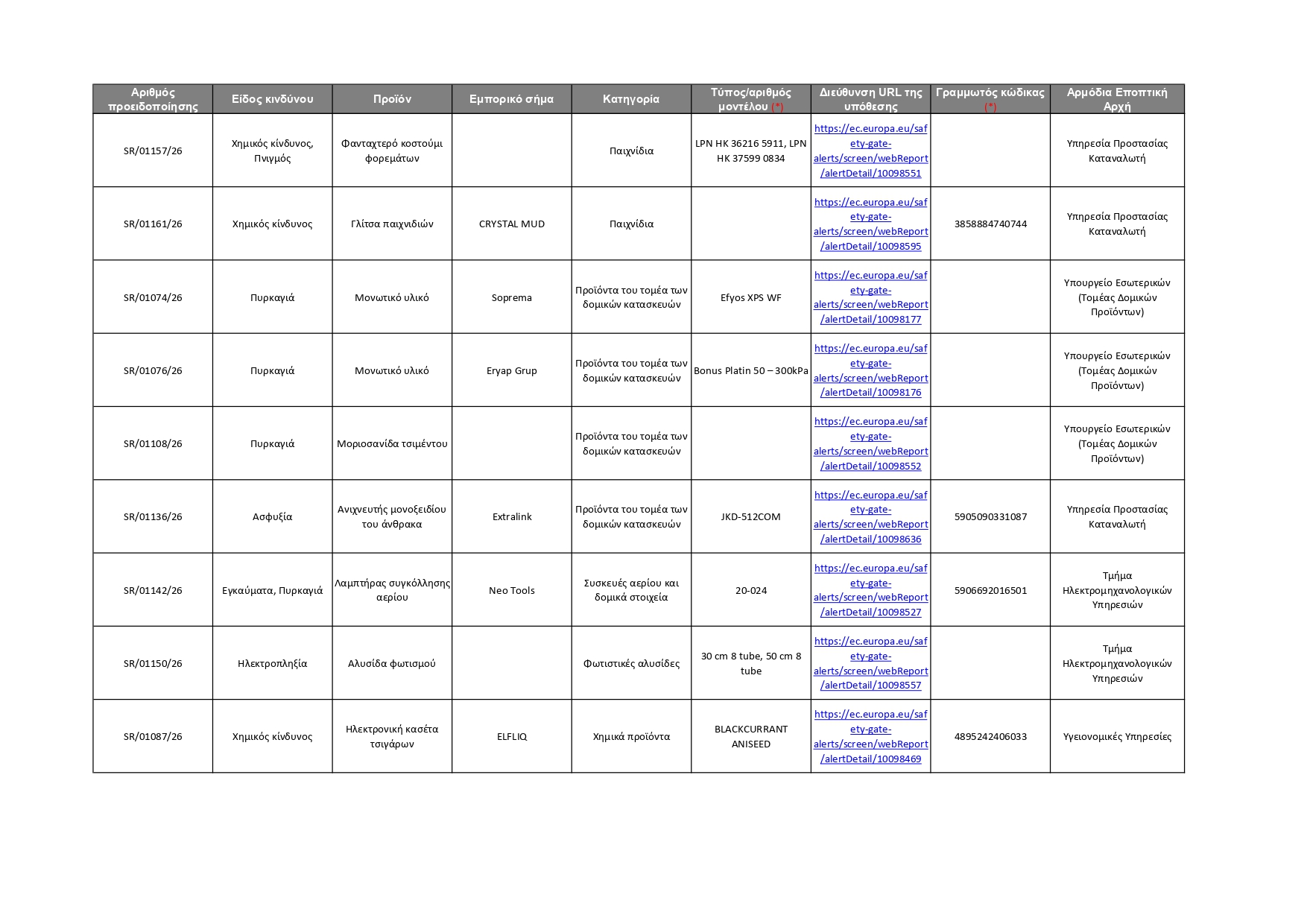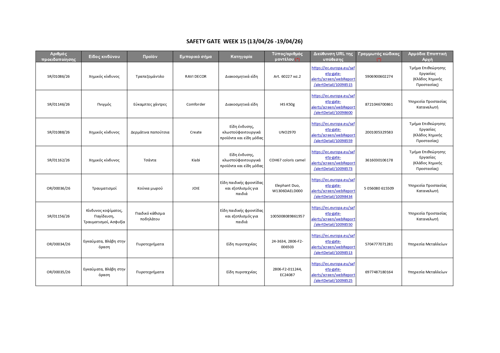 Όλες οι πληροφορίες για τα 92 προϊόντα που κοινοποιήθηκαν αυτή την εβδομάδα, καθώς και οι αρμόδιες Αρχές που αυτά αφορούν, φαίνονται στον πίνακα που παρατίθεται πιο κάτω. Οι καταναλωτές μπορούν επίσης να ανατρέξουν απευθείας στην ιστοσελίδα του Safety Gate, για να αναζητήσουν όλα τα προϊόντα που έχουν κοινοποιηθεί στο σύστημα και να λάβουν σχετικές πληροφορίες, ώστε να αποφύγουν τη χρήση τους. Σημειώνεται ότι η ιστοσελίδα του Safety Gate παρέχεται και στην ελληνική γλώσσα.