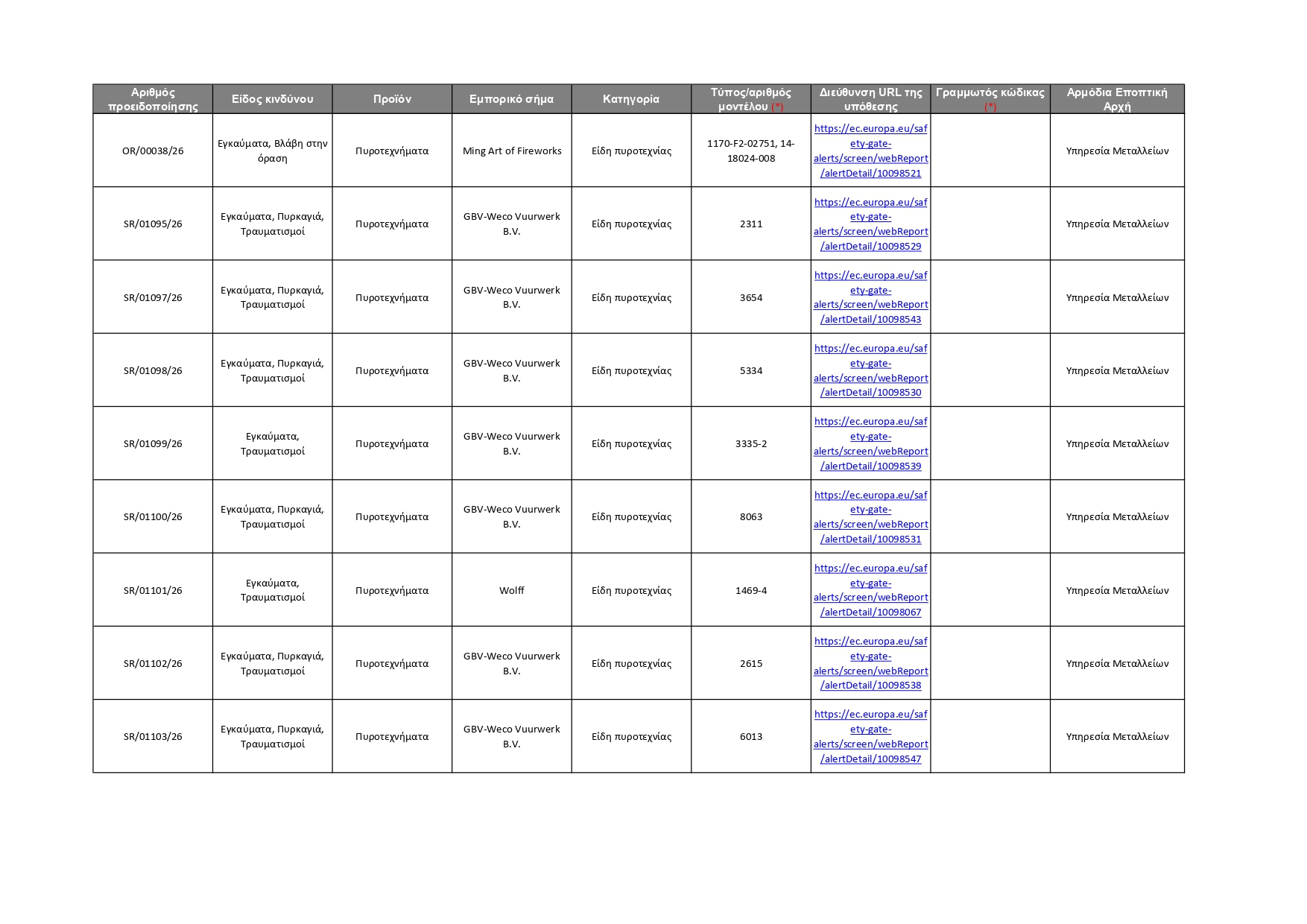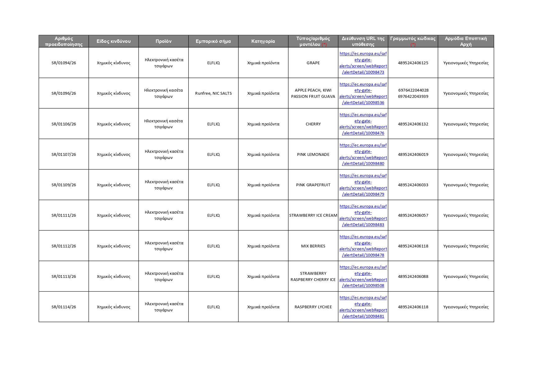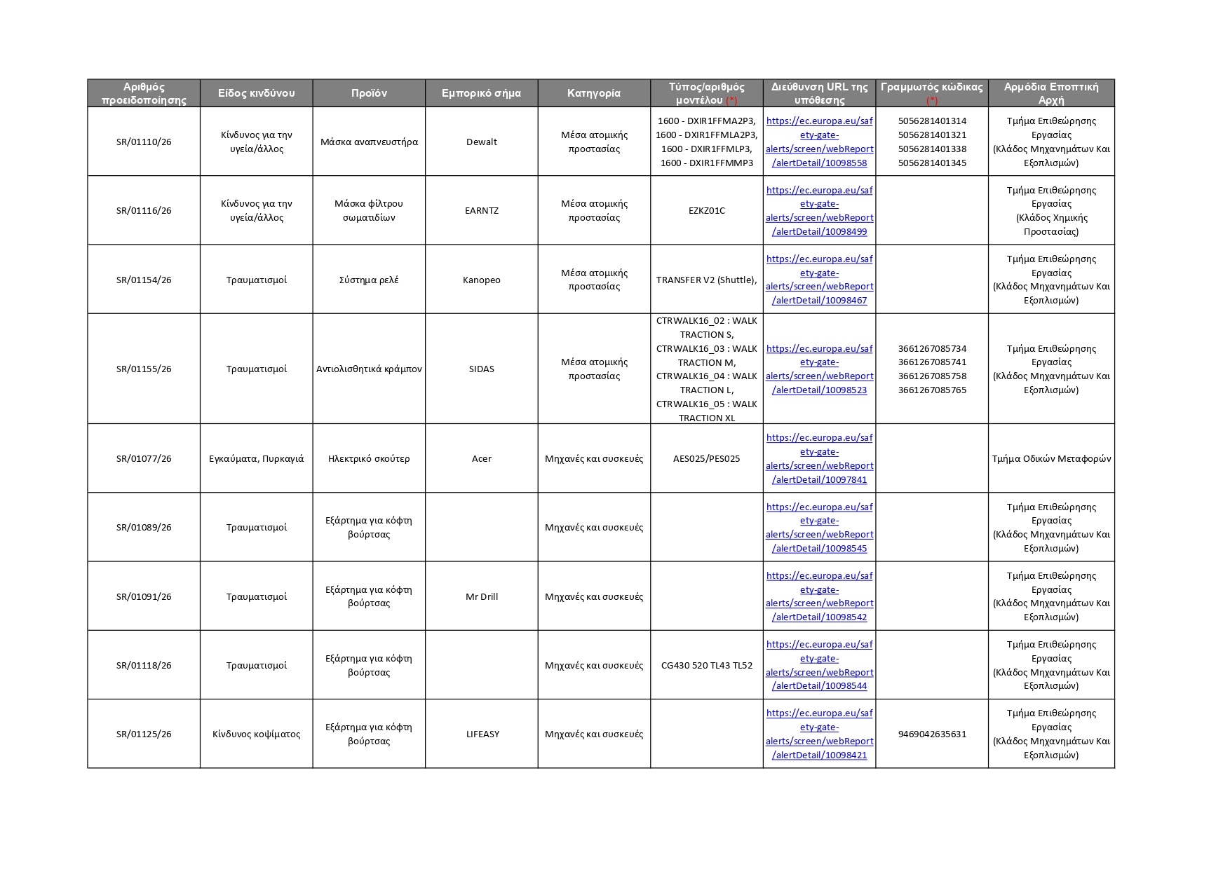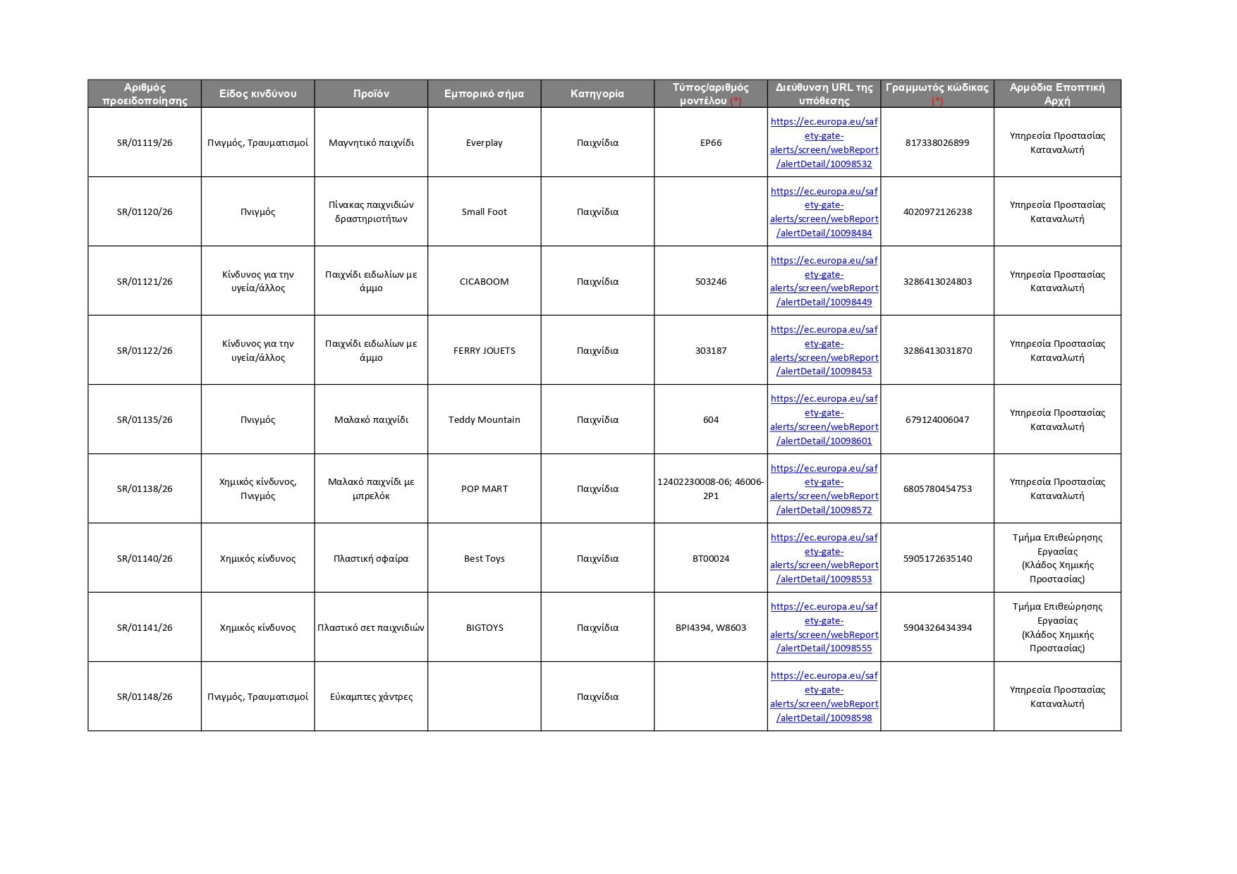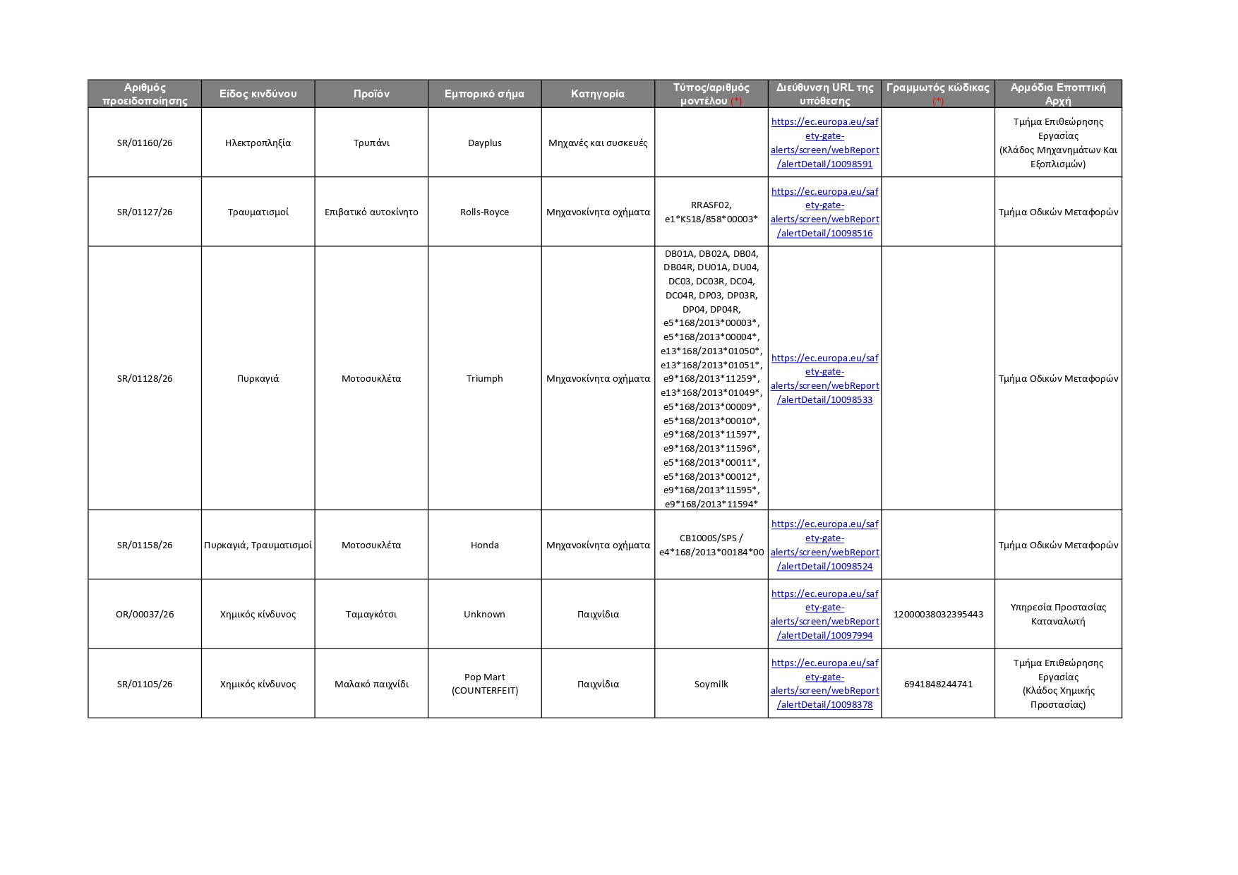 Όλες οι πληροφορίες για τα 92 προϊόντα που κοινοποιήθηκαν αυτή την εβδομάδα, καθώς και οι αρμόδιες Αρχές που αυτά αφορούν, φαίνονται στον πίνακα που παρατίθεται πιο κάτω. Οι καταναλωτές μπορούν επίσης να ανατρέξουν απευθείας στην ιστοσελίδα του Safety Gate, για να αναζητήσουν όλα τα προϊόντα που έχουν κοινοποιηθεί στο σύστημα και να λάβουν σχετικές πληροφορίες, ώστε να αποφύγουν τη χρήση τους. Σημειώνεται ότι η ιστοσελίδα του Safety Gate παρέχεται και στην ελληνική γλώσσα.