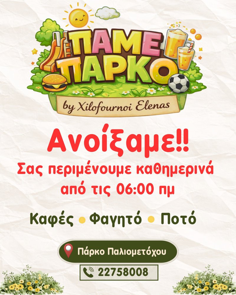 Το «Πάμε Πάρκο by Xilofournoi Elenas» συνδυάζει την ποιότητα της γνωστής μας αλυσίδας φούρνων με την ανεπιτήδευτη χαλάρωση ενός πάρκου, δημιουργώντας έναν χώρο ιδανικό για οικογένειες, παρέες αλλά και για όσους αναζητούν μια σύντομη απόδραση μέσα στην ημέρα τους.