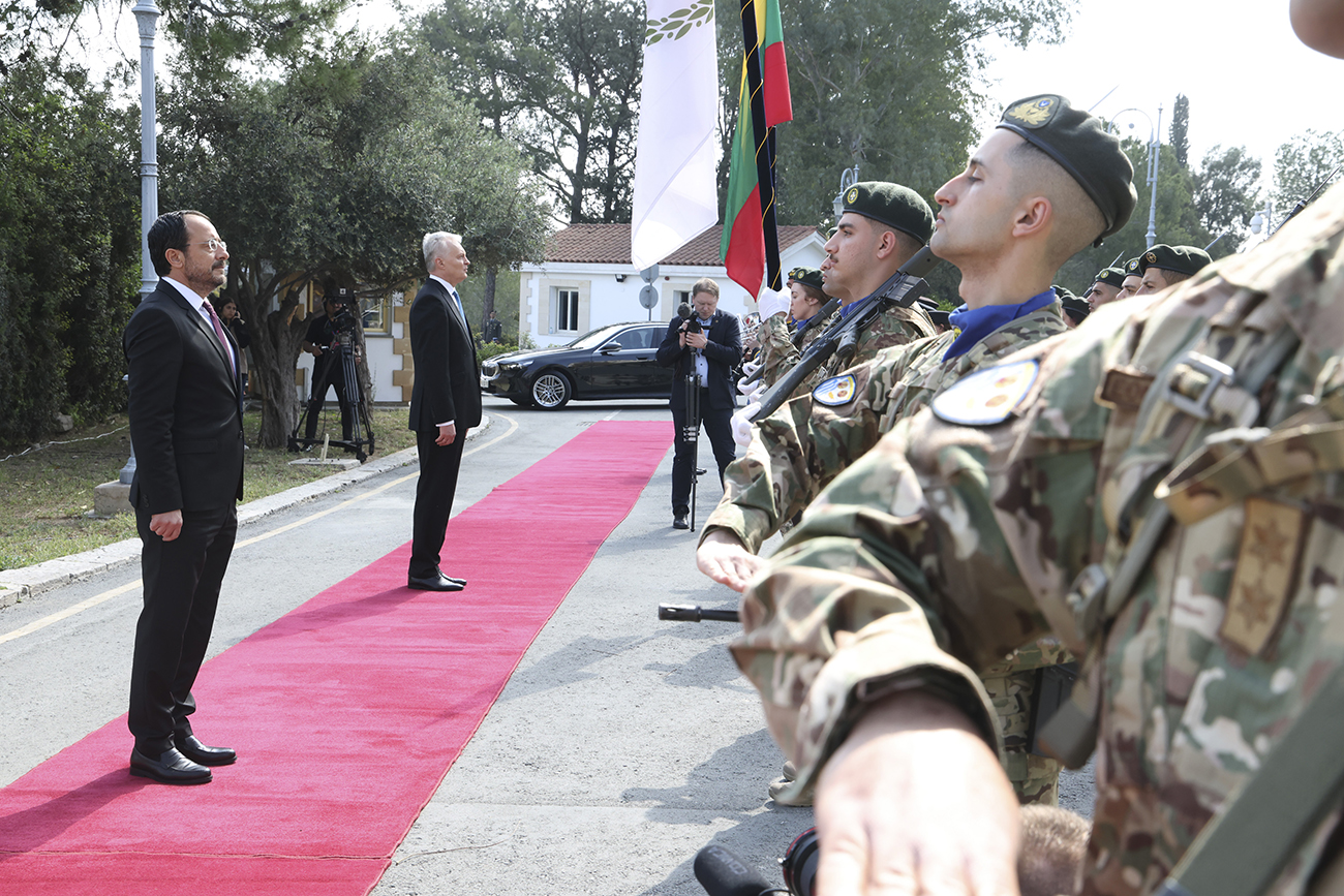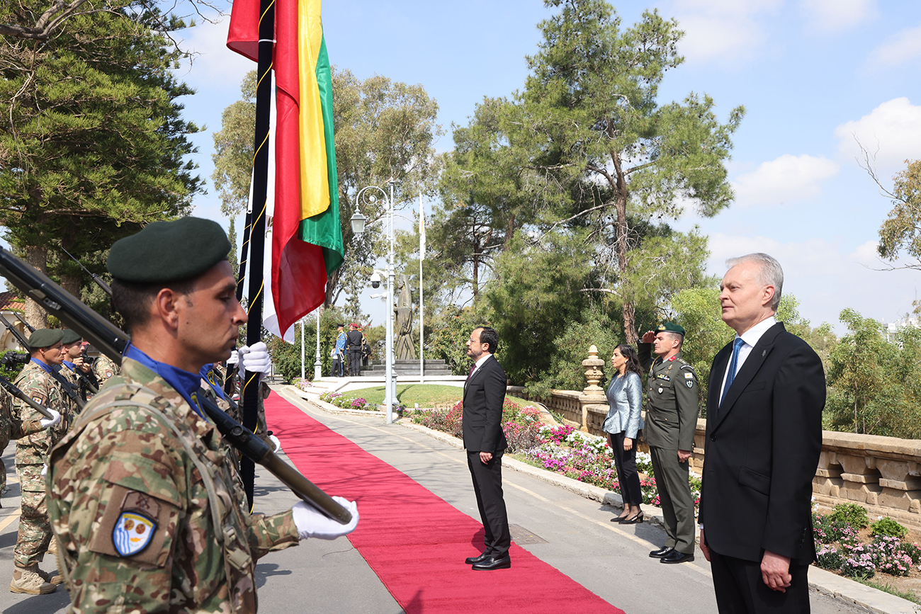 Ο Πρόεδρος της Λιθουανίας έφθασε το πρωί στο Προεδρικό Μέγαρο, όπου τον υποδέχθηκε ο Πρόεδρος Χριστοδουλίδης, ενώ στρατιωτικό άγημα απέδιδε τιμές.