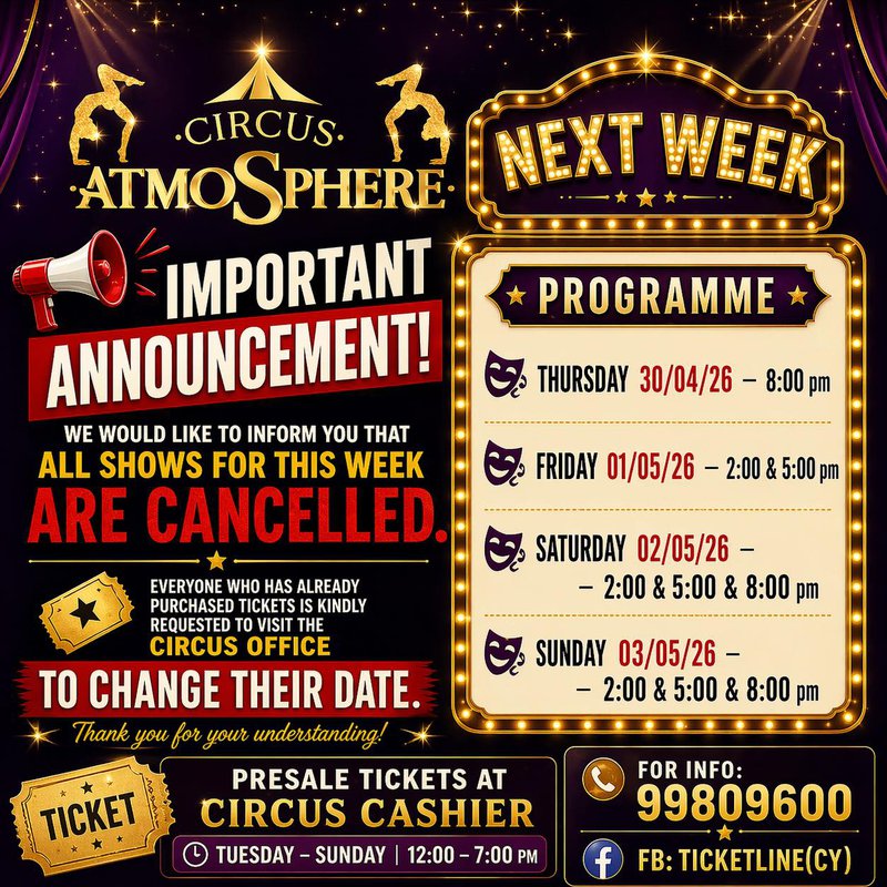 Όσοι έχουν ήδη προμηθευτεί εισιτήρια για τις ακυρωμένες παραστάσεις καλούνται να επισκεφθούν το ταμείο του τσίρκου, προκειμένου να αλλάξουν την ημερομηνία τους και να εξυπηρετηθούν για τις επόμενες διαθέσιμες παραστάσεις.