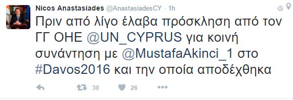 Όπως έγραψε στο λογαριασμό του στο Twitter, "πριν από λίγο έλαβα πρόσκληση από τον ΓΓ ΟΗΕ για κοινή συνάντηση με τον Μουσταφά Ακιντζί στο Νταβός και την οποία αποδέχθηκα".