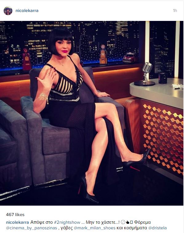 Η ηθοποιός έκανε είσοδο με ένα μαύρο φόρεμα με εναλασσόμενες διαφάνειες και αποκαλυπτικό μπούστο και γι ακόμα μια φορά κέρδισε τις εντυπώσεις. Η ίδια η σύζυγος του Φώτη Πιττάτζιη ανέβασε φωτογραφία στο Instagram από την εμφάνισή της στο 2night show προκαλώντας τους διαδικτυακούς της φίλους με τα καλλίγραμμά της πόδια να παρακολουθήσουν την εκπομπή, που θα προβληθεί την Τέταρτη το βράδυ.