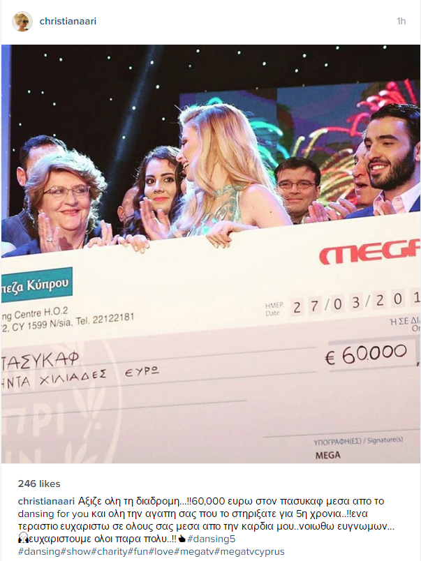 Η Χριστιάνα Αριστοτέλους με ένα post της στο instagram θέλησε να ευχαριστήσει όλους όσοι στήριξαν το φιλανθρωπικό σόου του Mega, DanSing For You 5, το οποίο στο τέλος παρέδωσε μια επιταγή με το ποσό των 60 χιλιάδων ευρώ στον ΠΑΣΥΚΑΦ.