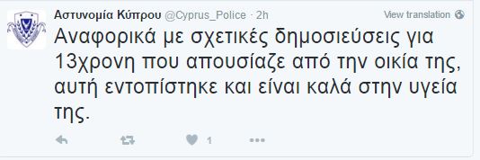 Η Αστυνομία Κύπρου ενημέρωσε το κοινό άμεσα μέσω του Twitter, αναφέροντας πως η 13χρονη είναι καλά στην υγεία της.