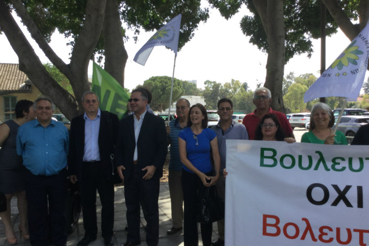 Λίγο πριν την έναρξη της διαδικασίας για την ανάδειξη του νέου προέδρου της Βουλής, υποστηρικτές και φίλοι του Κινήματος Οικολόγων εμφανίστηκαν με πανό έξω από το χώρο του κυπριακού κοινοβουλίου.