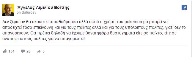Συγκεκριμένα έγραψε «Δεν ξέρω αν θα ακουστεί οπισθοδρομικο αλλά αφού η χρήση του pokemon go μπορεί να αποδειχτεί τόσο επικίνδυνη και για τους παίκτες αλλά και για τους υπόλοιπους πολίτες, γιατί δεν το απαγορευουν; Θα πρέπει δηλαδή να έχουμε θανατηφόρα δυστυχηματα είτε σε παίχτες είτε σε ανυποψιαστους πολίτες για να απαγορευτεί!»