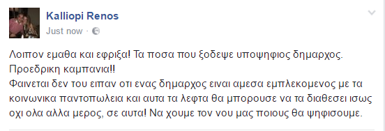 Το ζεύγος Καλλιόπη Ρένος ξαναχτύπησε και αυτή τη φορά στο στόχαστρο έθεσε έναν υποψήφιο δήμαρχο, προφανώς κάποιου δημου της πρωτεύουσας και ο λόγος δεν είναι άλλος από τα λεφτά που ξόδεψε για την εκστρατεία του.