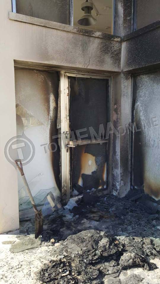 Αμέσως επήλθε ανάφλεξη των χάρτινων κιβωτίων τα οποία έκαψαν την πόρτα και τους τοίχους. Για την κατάσβεση της φωτιάς χρειάστηκε η επέμβαση της Πυροσβεστικής Υπηρεσίας.